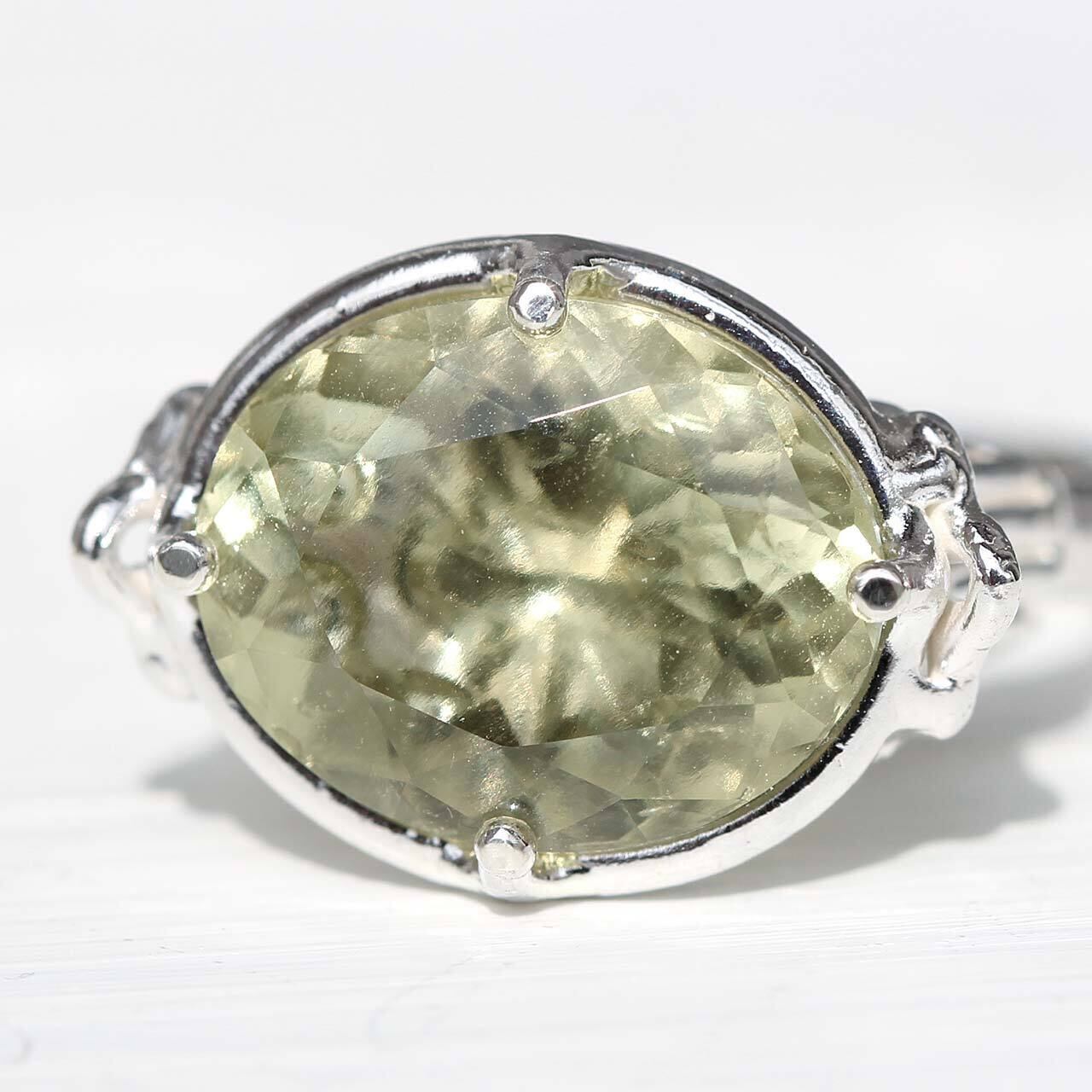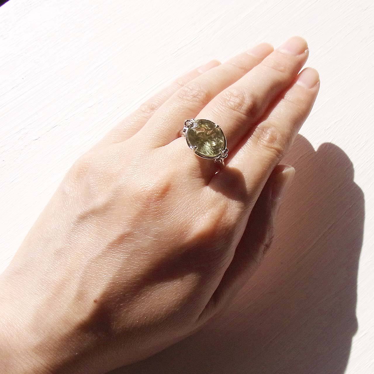 隕石が落ちたことでこの天然ガラスになったのかと思うと、なんともロマンたっぷりの素敵な石です。肌のなじみも良い色合いでお使いいただきやすいリングかと思います。