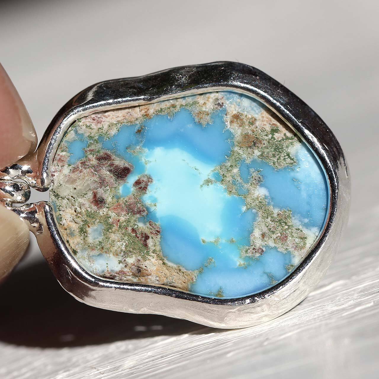 スカイブルーの濃淡がある色合いで、淡いベージュ色と赤茶色の母岩が入り込んでいます。
