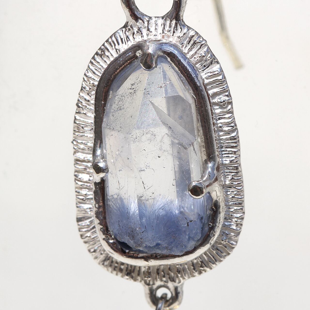 端正な形の水晶の原石です。爽やかな淡い青色のディモルチェライトの様子も存分にお楽しみいただけるかと思います。涼しげな雰囲気のピアスです。