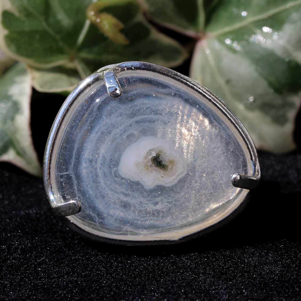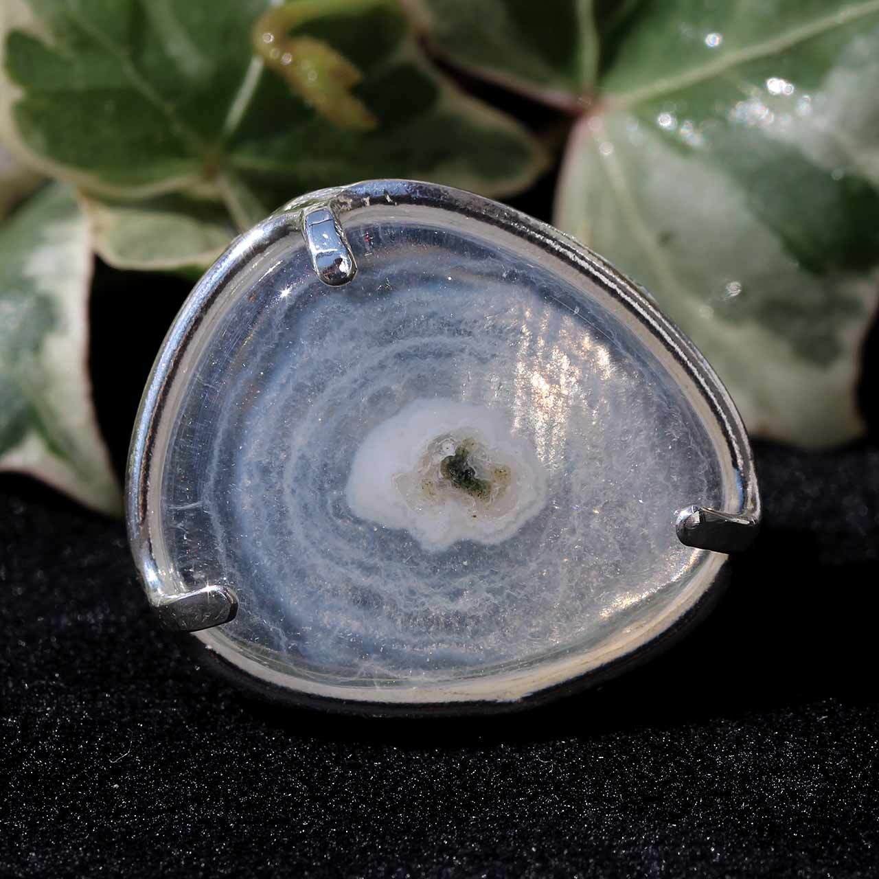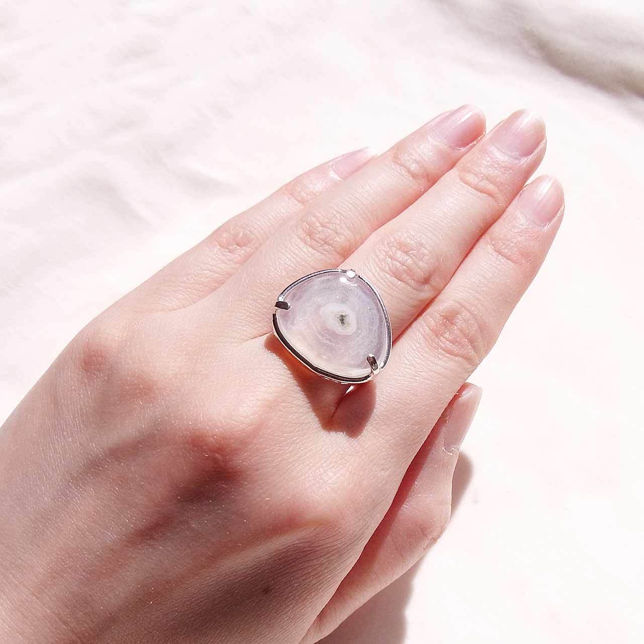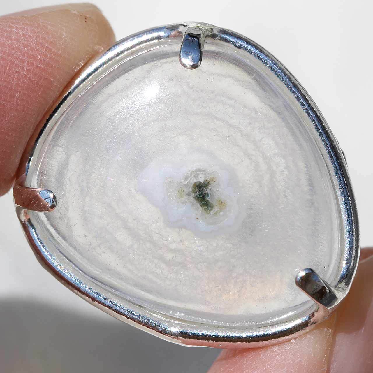 中央のグリーンがかった内包物の周囲に白い瑪瑙が覆い、さらにその周りをクオーツが囲んでいます。クオーツの部分にも白い輪のような模様が入っています。ふんわりとした白っぽい色合いですが、透明感もあります。