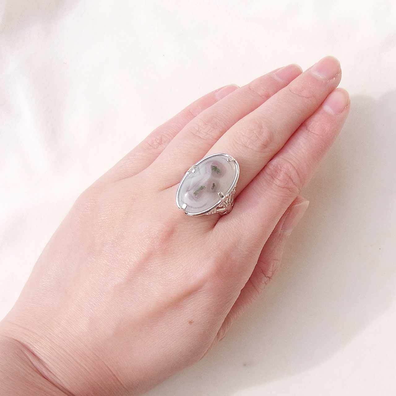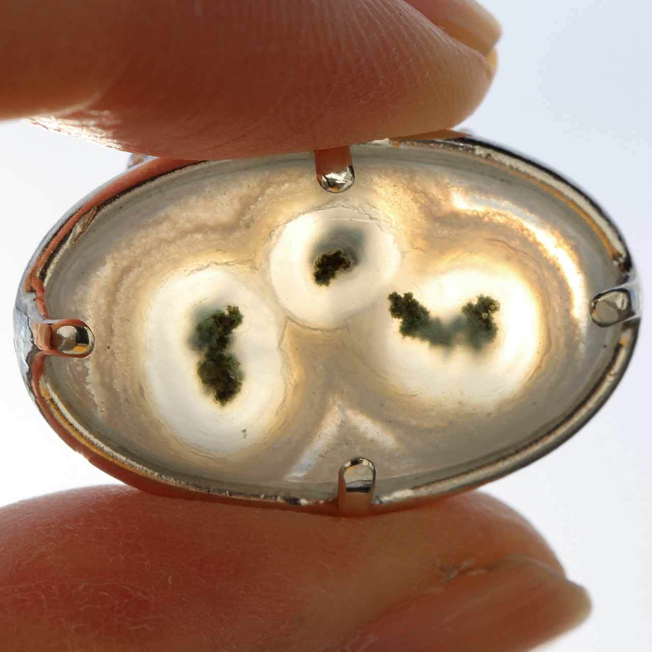 3箇所に入っている渋めなグリーンのインクルージョンはクローライトで、このグリーンが苔のように見える事から、「モス(苔)クオーツ」と呼ばれているようです。クローライトの周りには透明感のある層があり、それを縁取るかのように白く濁った層(おそらく瑪瑙かと思われます)に囲まれています。表面のクローライト部分に原石由来のへこみがあります(画像3枚目をご参照ください)。