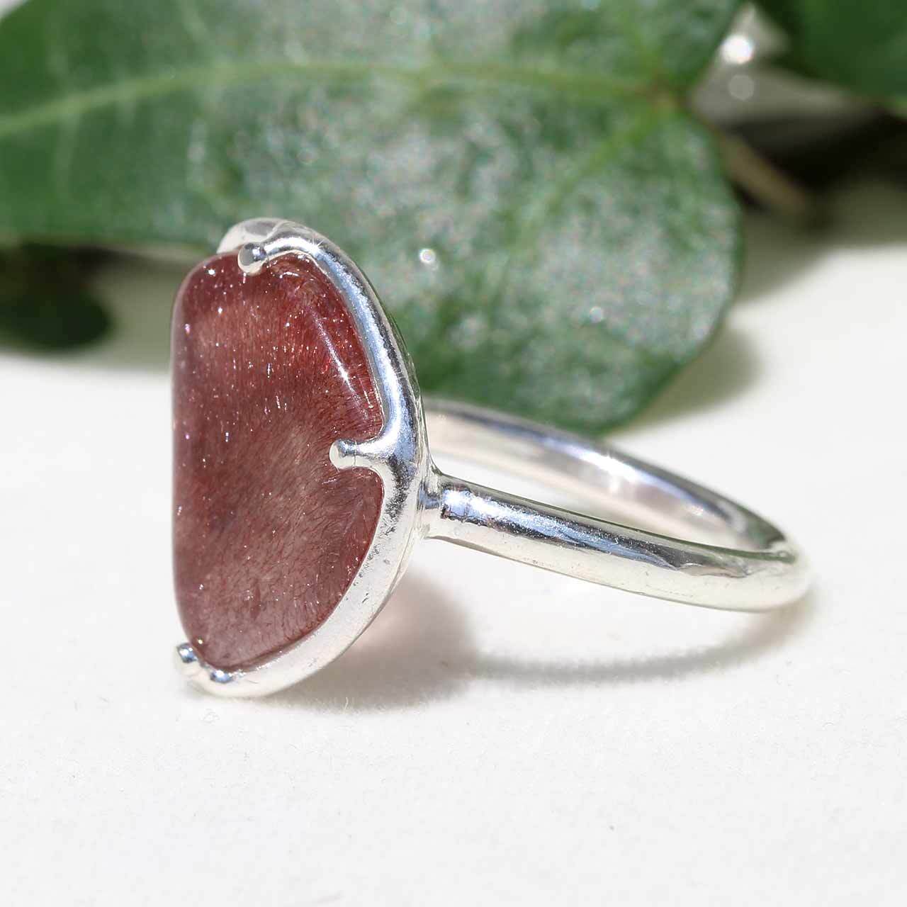 流通名で「ストロベリークオーツ」とも呼ばれています。よく見ると一方方向に整列しているかのようにゲーサイトが規則正しく入っている部分もあります。光に当てると赤いゲーサイトがキラキラと輝く素敵な石です。