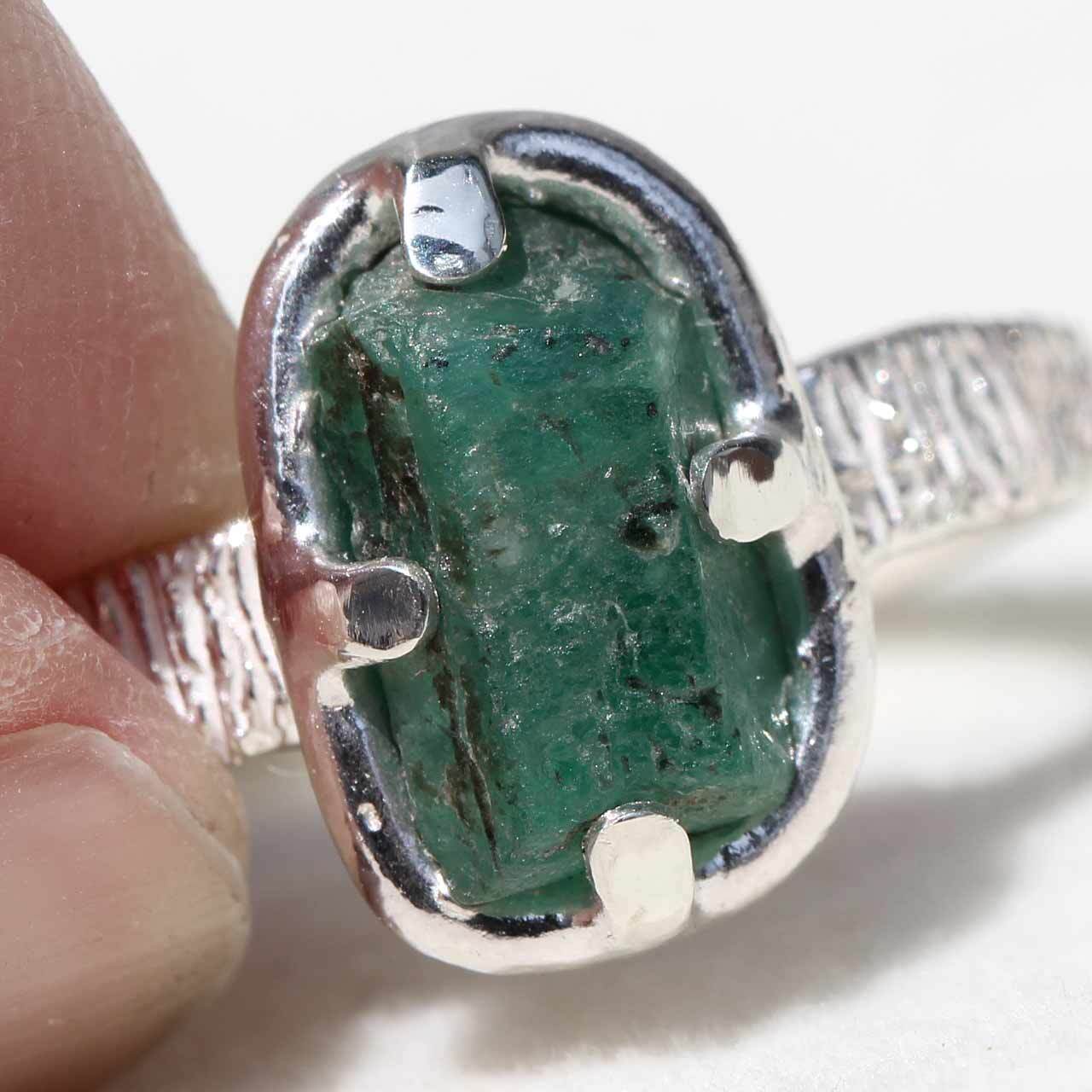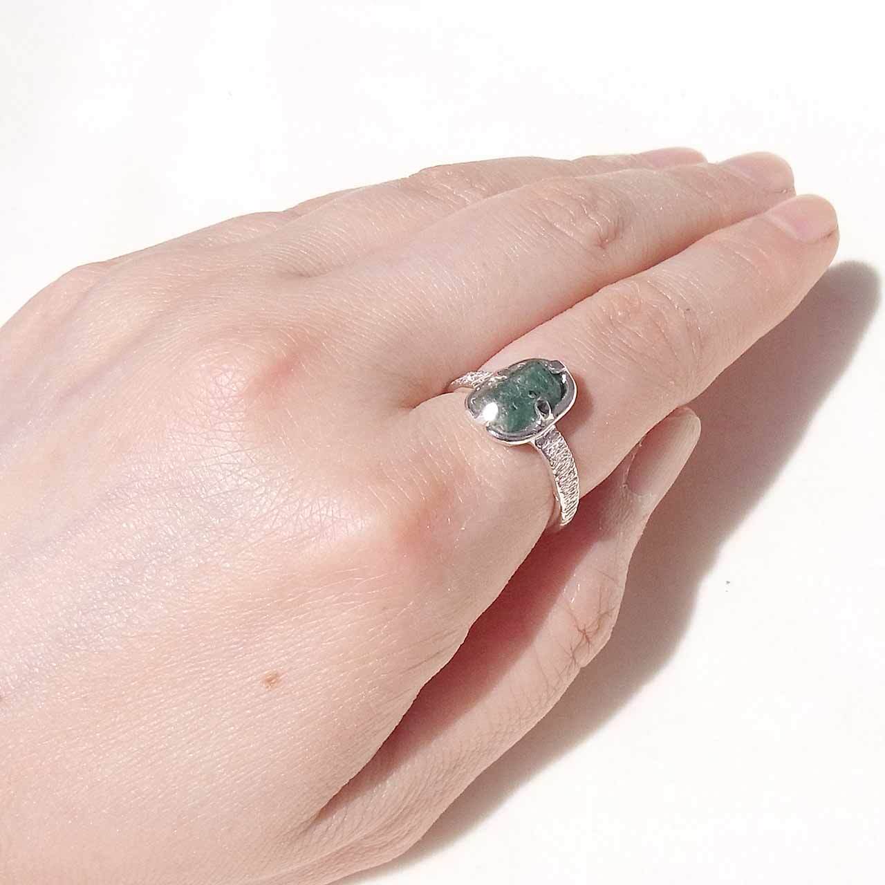 エメラルドのよくあるイメージの六角柱の原石ではありませんが、今回の4点の中では一番六角柱に近い形状です。深緑のような爽やかな印象です。5月の誕生石でもあるエメラルド、小さめの石でも目を引くリングです。