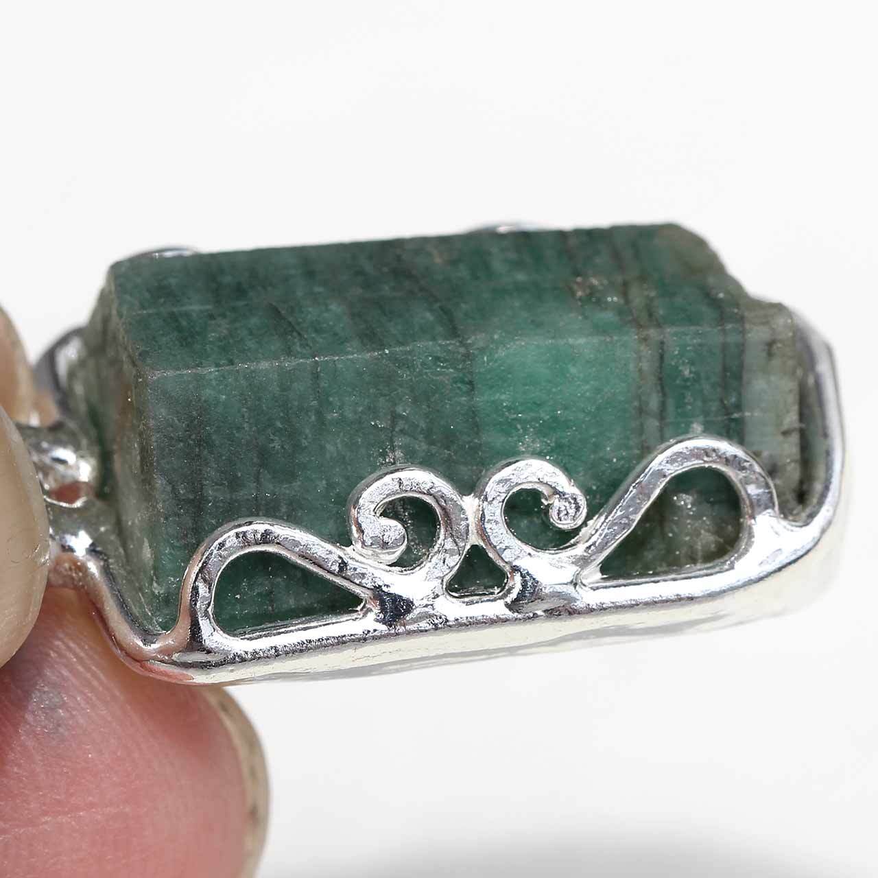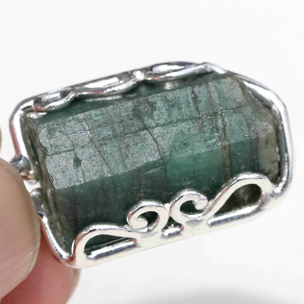 深緑色で不透明のエメラルドです。表面はかっちりと角があり、また裏面はゴツゴツとした形がユニークです。白色や黒色が入り色むら、黒いインクルージョン、クラックがあります(画像5枚目から7枚目をご参照ください)。