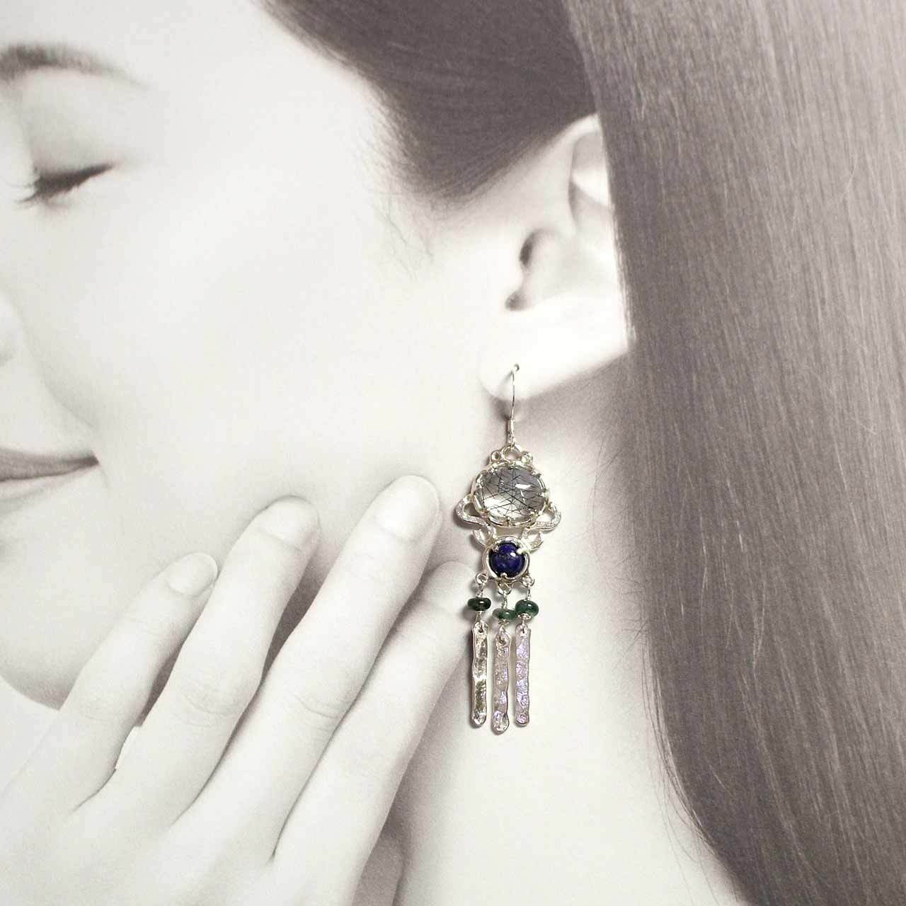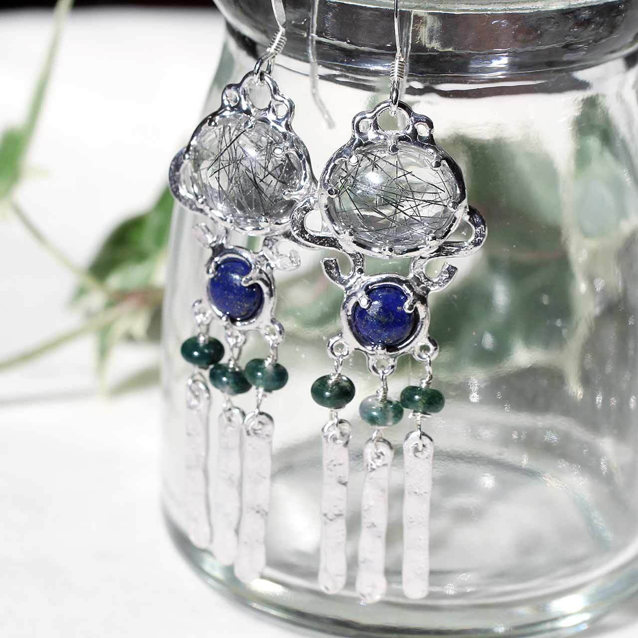 ブラックトルマリンの針状結晶が入ったクオーツは透明感が高く、内部の様子がよく見えるルースを使いました。ラピスラズリはかなり濃い群青色で、表面に微細なパイライトのブロンズ色が見られます。下には深いグリーンのモスアゲートのビーズと槌目をつけた棒状のパーツを下げました。
