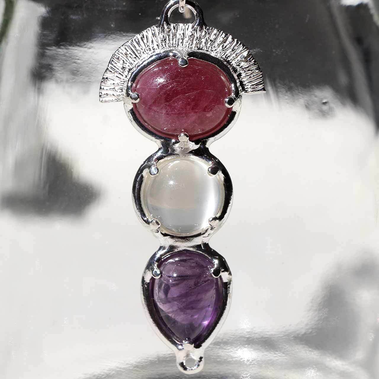 トルマリンは濃いピンク色で、透明感はほぼなく(光は透過します)、クラックが見られます。ムーンストーンは乳白色で、縦に光の筋が見えるように配置しました。アメシストは一部に色むらやインクルージョンはありますが、綺麗な紫色の雫形のルースを使いました。