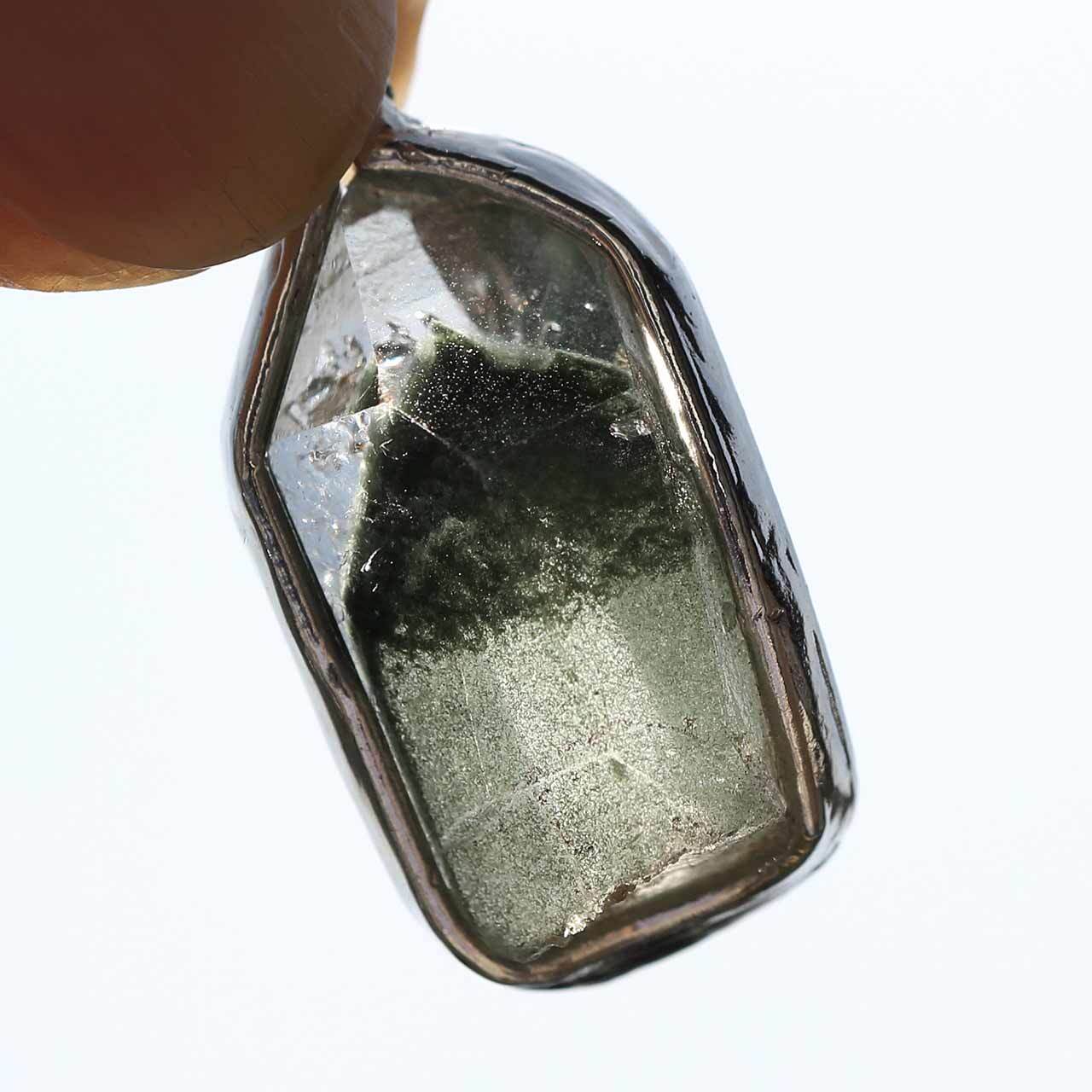 ファントムクオーツはブラジルのカブラル山脈産のもので、グリーンのクローライトが山の形に水晶の中に入っています。上部の方が濃いグリーンです。下の方には赤茶色のインクルージョンも見られます。透明感が高いので、山の様子がよく見えます。