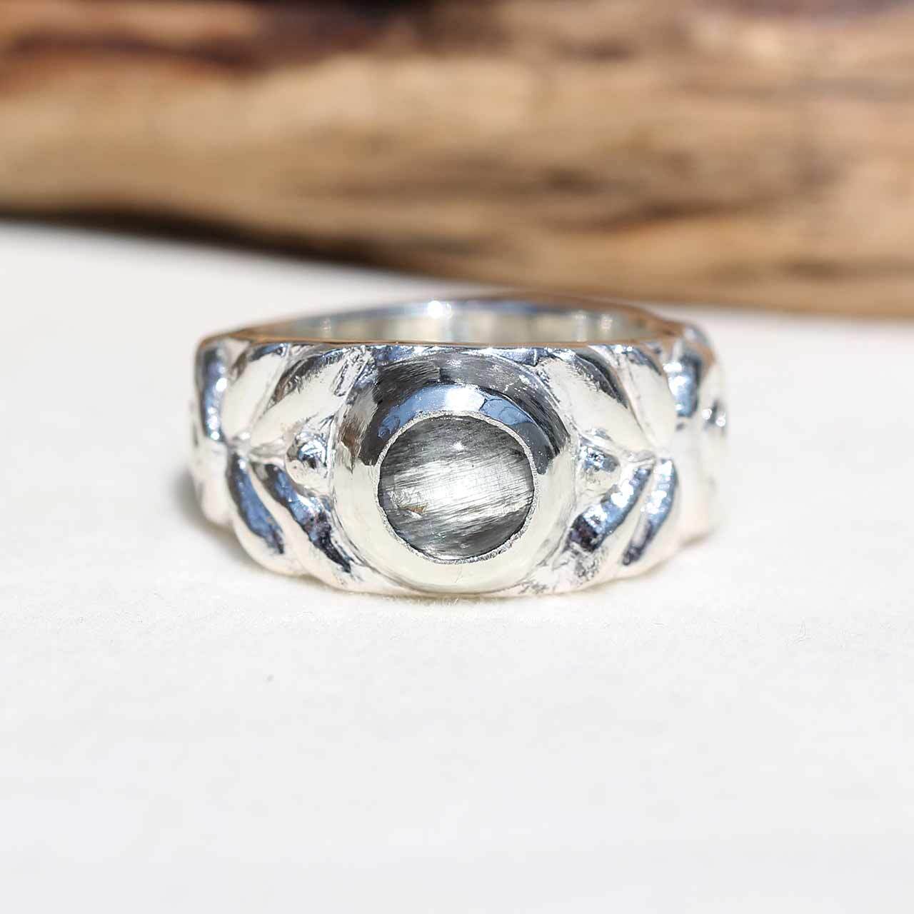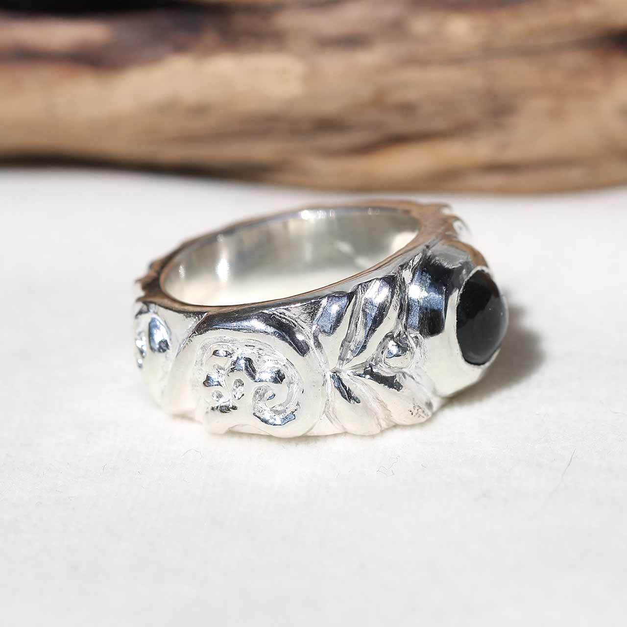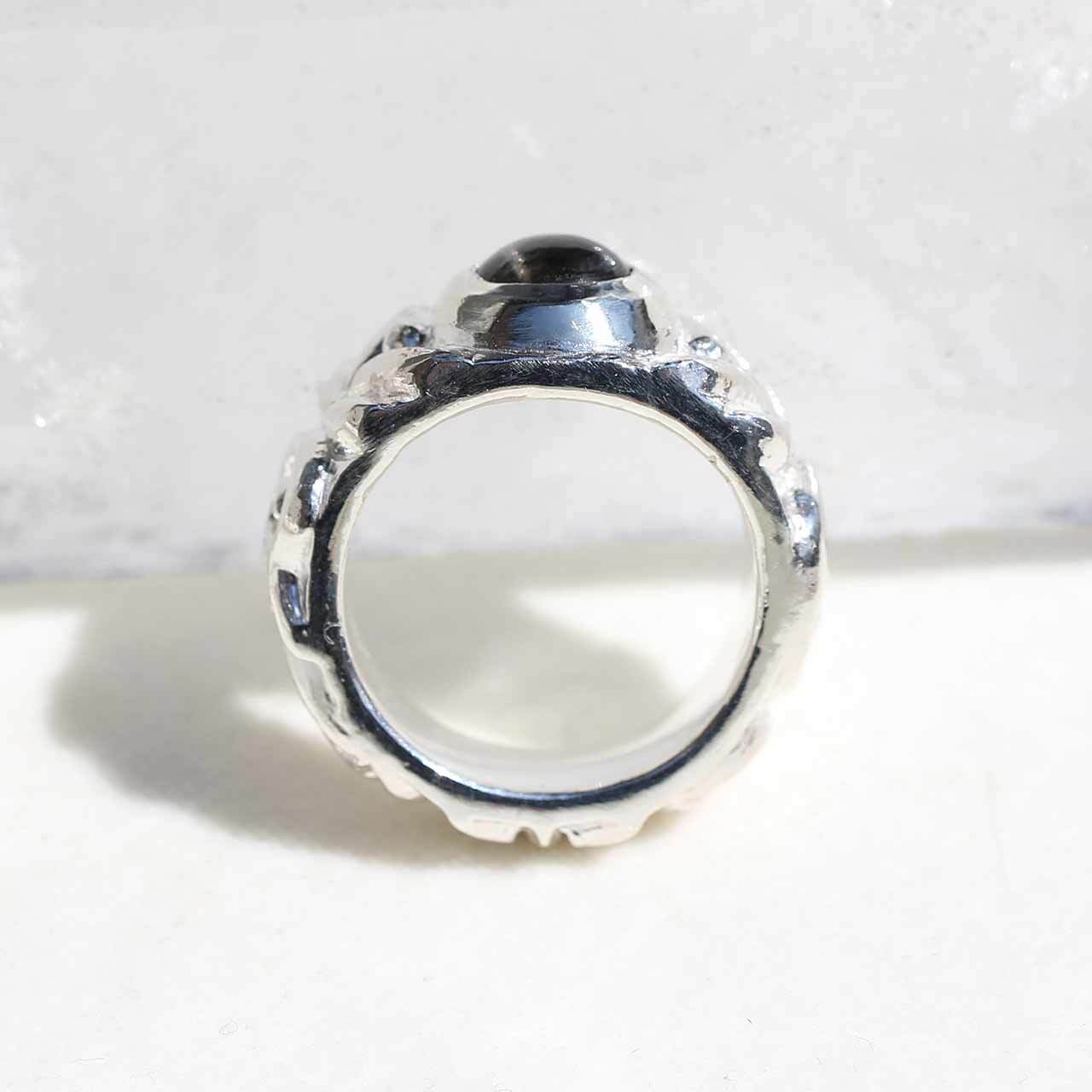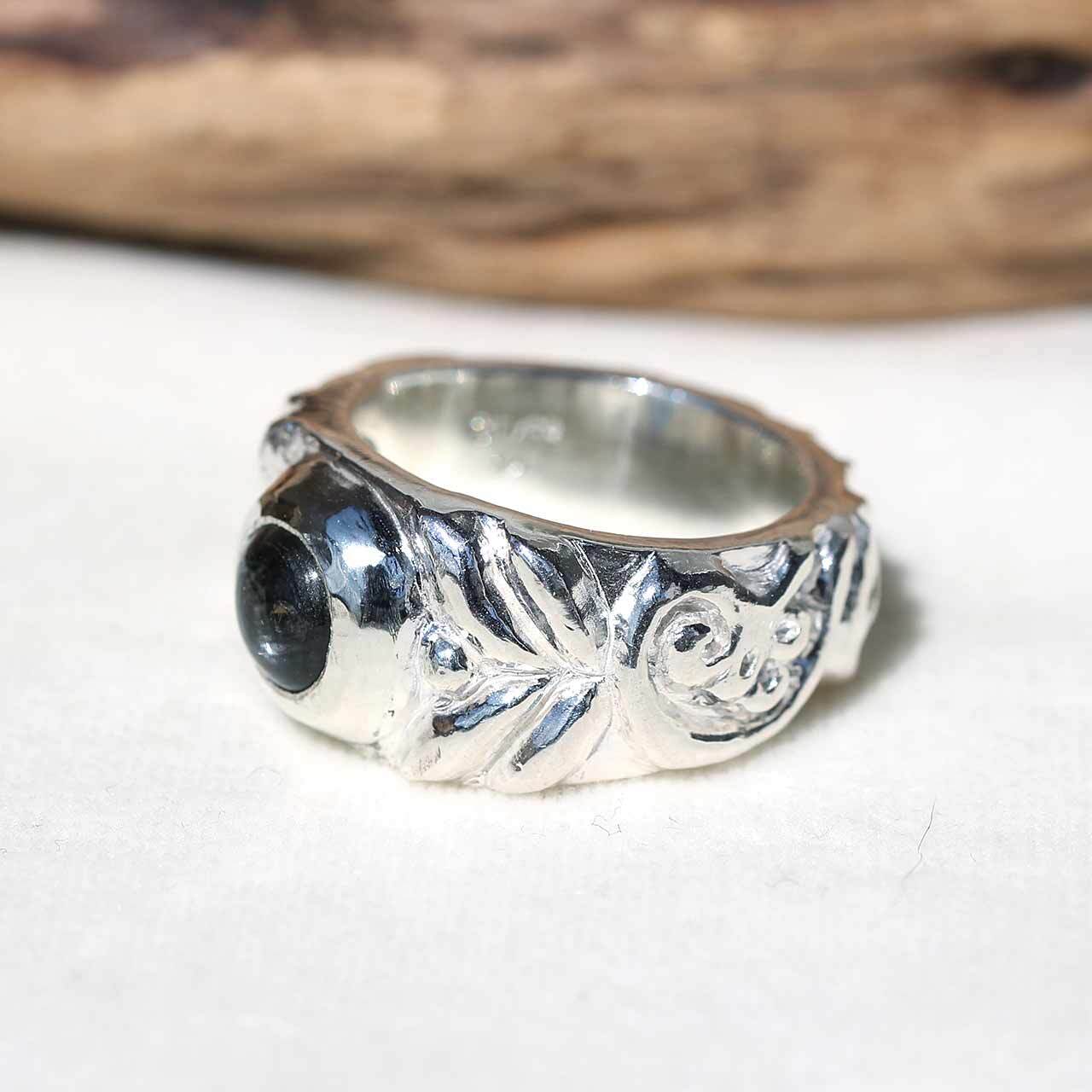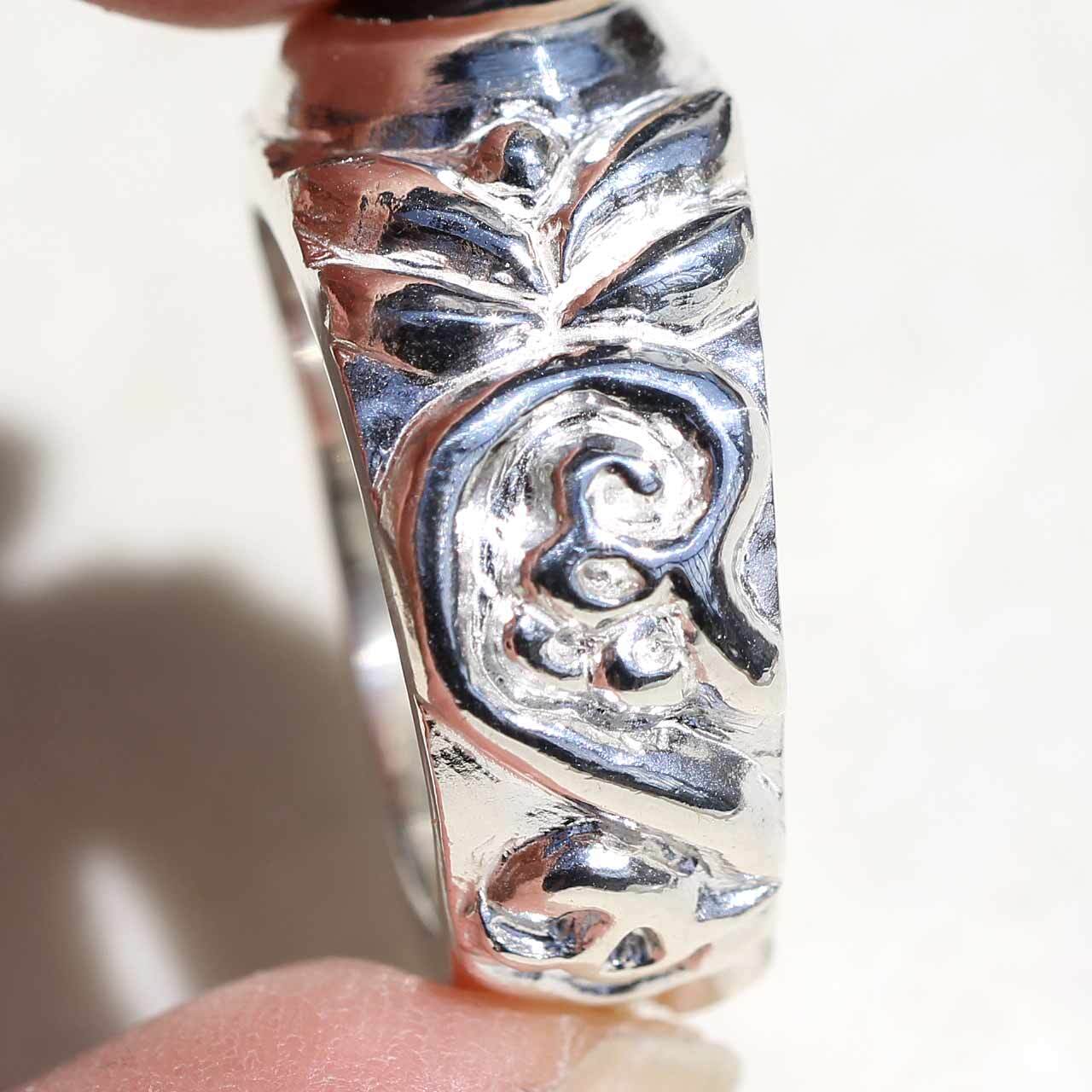 古代の遺跡から発掘されたようなジュエリーを作りたいと思い制作したリングです。古代から愛され世界各地に広がった普遍的な文様をリングの腕にひとつずつ全て手作業で彫り込んでいます。シルバーもかなり使っていますので、しっかりとした重量があります。