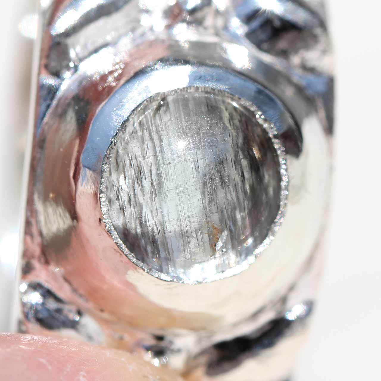 アクアマリンは青味のないほぼカラーレス(無色透明)のもので、横方向に黒いインクルージョンが全体に入っています。一部、へこみがあります(画像7、8枚目をご参照ください)。