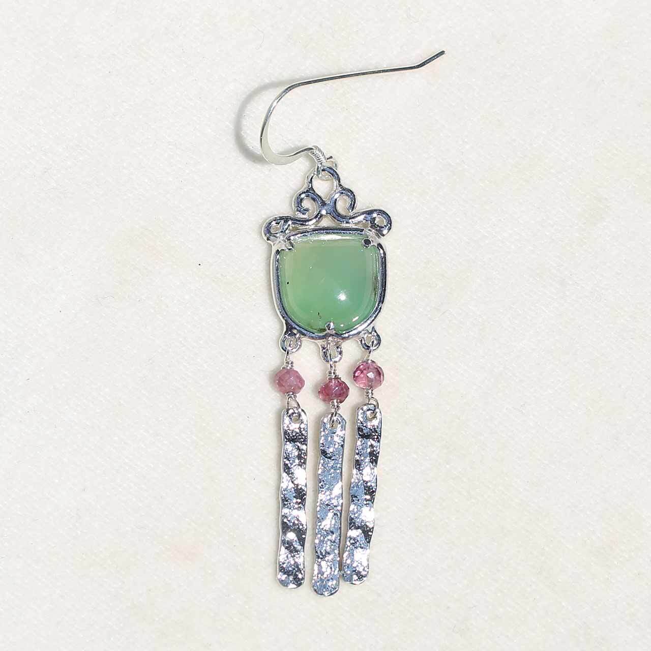 クリソプレーズはかなり淡めのミントグリーンの色合いです。石の厚みから来るのだと思いますが、上部から下部にかけてグラデーションのように色の濃度が変化しているように見えます。一部黒い微細なインクルージョンがあります(画像3枚目をご参照ください)。