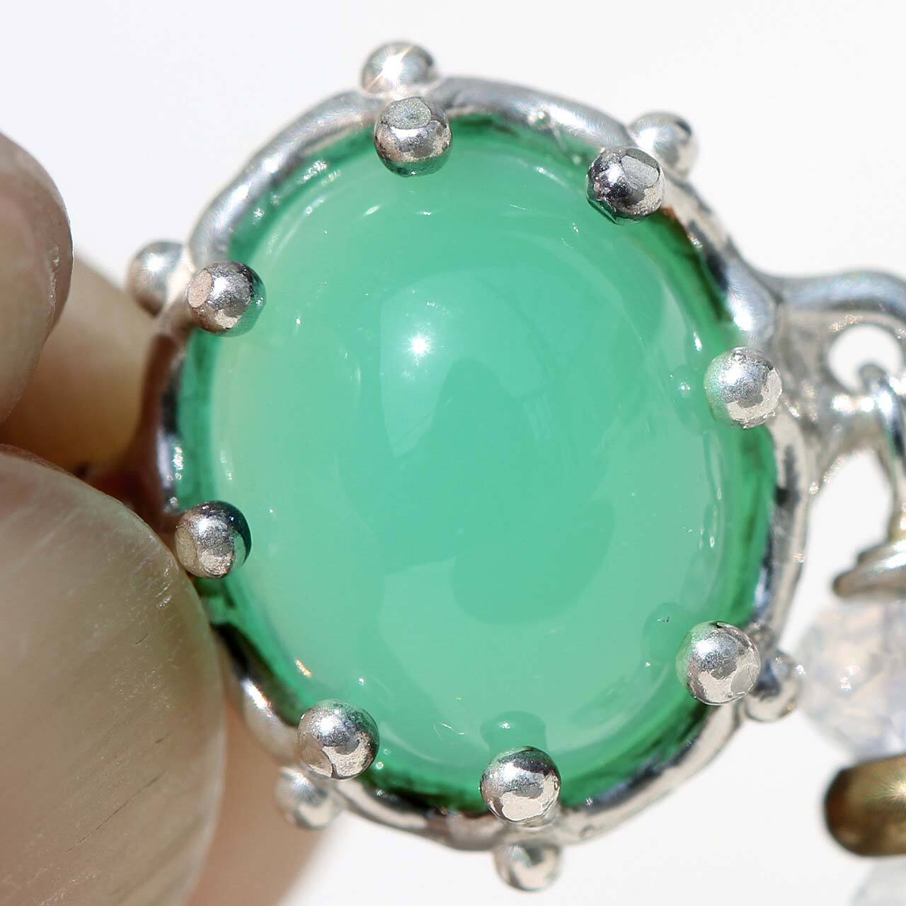 クリソプレーズの下にはレインボームーンストーン、真鍮、アクアマリンのビーズを下げました。アクアマリンに一部、インクルージョンがあります(画像6枚目をご参照ください)。